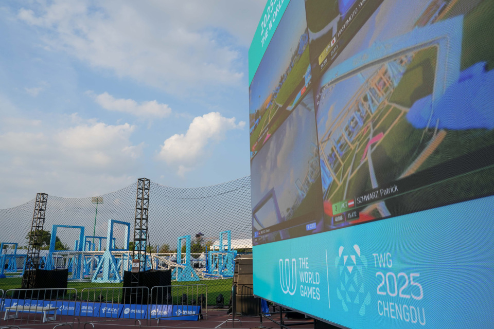 8月15日,无人机竞速比赛现场大屏直播比赛。新华社记者 李博 摄
